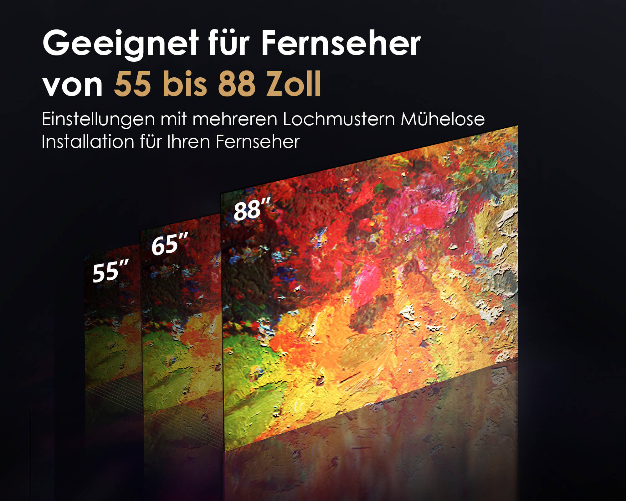 Der Eiffel V2 TT88 passt auf die meisten 55-88 Zoll großen Fernsehgeräte. Solange Ihr Fernseher in dieser Größenordnung liegt, brauchen Sie nicht mit dem Kauf zu hadern - er ist die perfekte Lösung für eine schwierige Wahl.