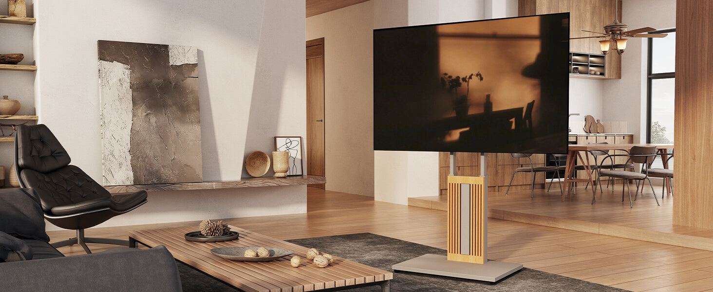 The removable back panel with built-in storage neatly holds all cables and accessories, ensuring a tidy look and a consistently clear viewing experience.