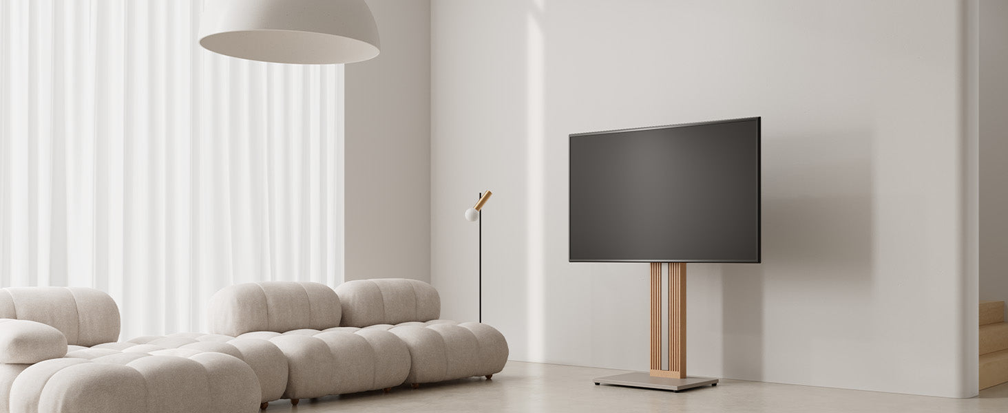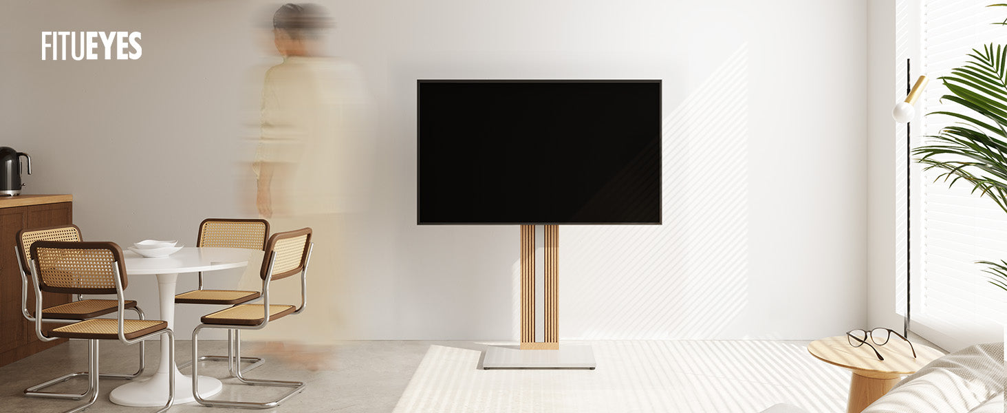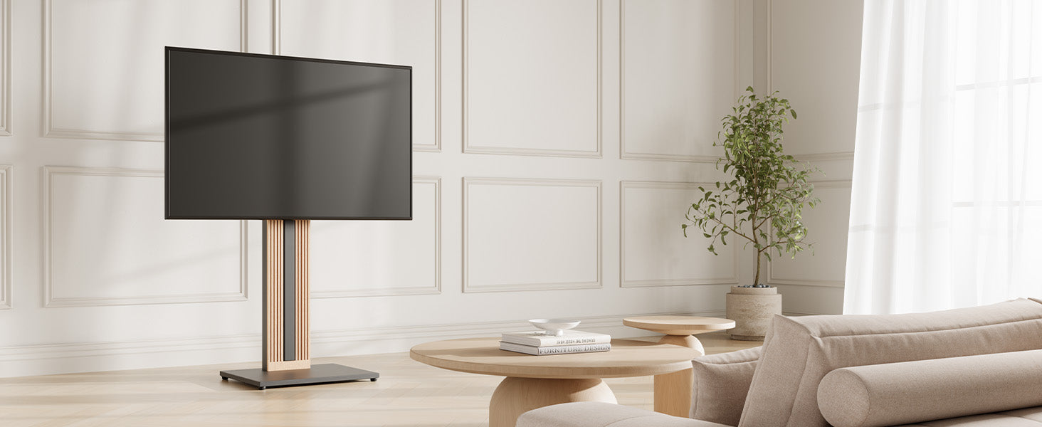 De ZEN-serie tv-standaard is niet alleen in hoogte verstelbaar, maar ook draaibaar.